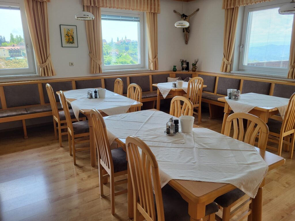 mit wunderschöner Frühstücksterrasse, von der Sie direkten Blick auf die Kirche von Kitzeck haben. Durch unsere einzigartige Lage können wir Ihnen Ruhe und Erholung bieten.